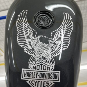 15Jan2025 その他 ファットボーイ リアフェンダー交換の為 純正ブルーマイカとピンストライプを塗装にて ベース色のブルーをAIカラーセンサーにて類似色を検索 カラーセンサーの指示通りに補正を重ねても全然合わない どうもパールが違う事が発覚 再三に渡り自力で調色しまして違和感なく完成